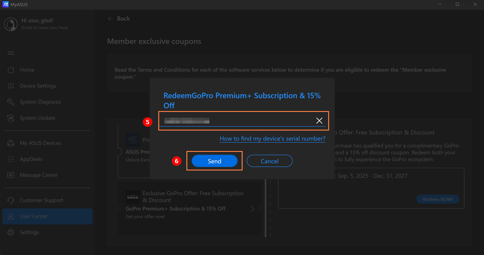4. Ingresa el SN⑤ y haz clic en "Enviar"⑥.