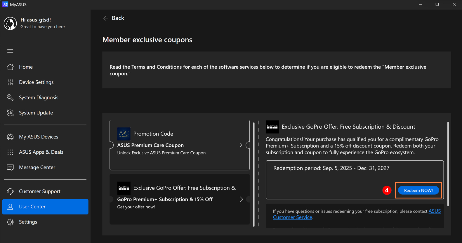 P: ¿La suscripción gratuita y el cupón de descuento del 15% son de redención única? Si hago clic en el banner de redención en la aplicación MyASUS y abro la página de redención de GoPro, ¿podré visitar la página de nuevo para canjear si decido salir de la página?