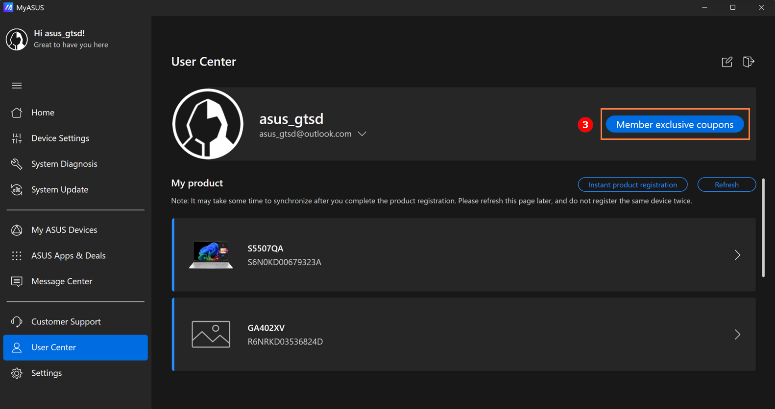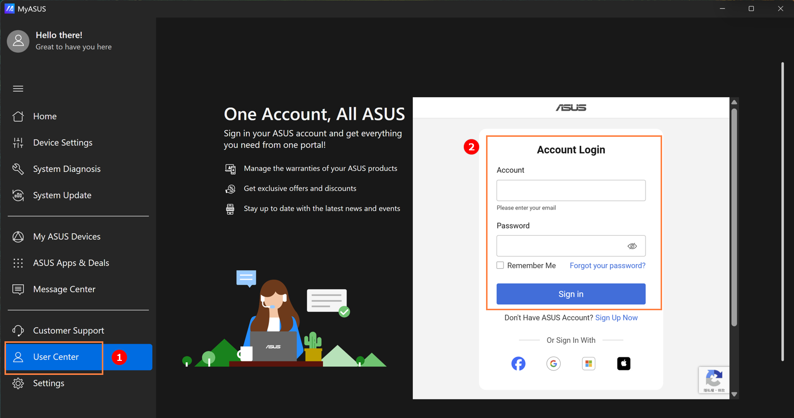 1. Ve a [Centro de Usuario][①] en MyASUS e inicia sesión[②].