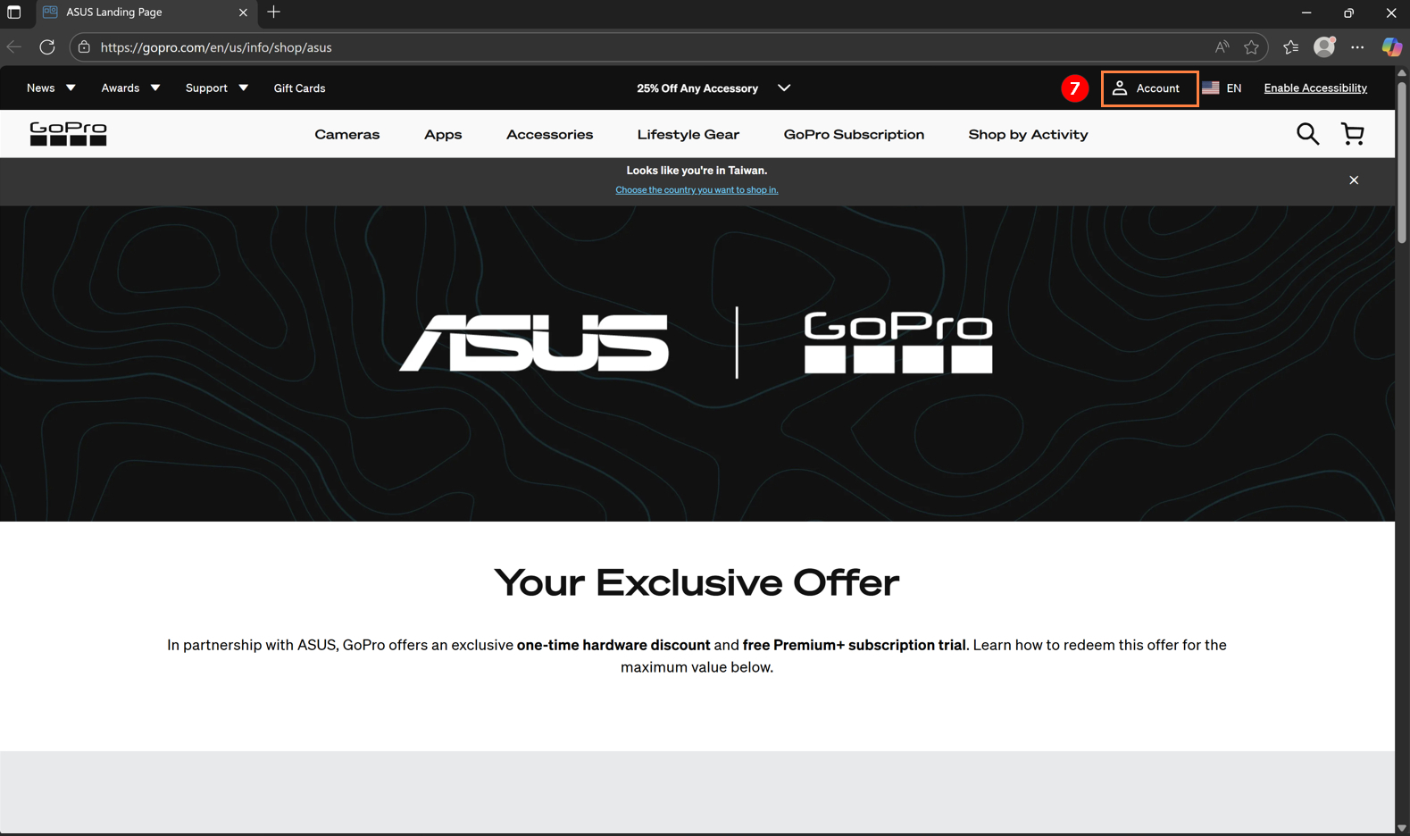 5. La página redirigirá automáticamente a la página de canje de GoPro. Haz clic en "Cuenta"⑦ en la esquina superior derecha.
