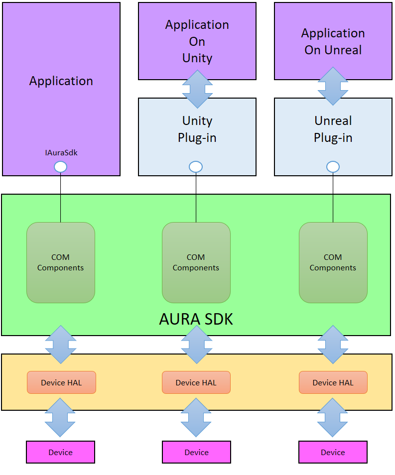 To support more AURA devices in a genral way and more programming languages other than C and C++, the AURA SDK has been re-structured from scratch. The latested version (v3.1) is built with Microsoft™’s Component Object Model (COM) technology (include support for OLE Automation), which makes it easy to be used with programming language with COM supported. Furthermore, device control functions are now seperated as Hardware Abstraction Layer (HAL) libraries. You can add/remove AURA devices support by simply installing/removing HAL’s without modifying your application.