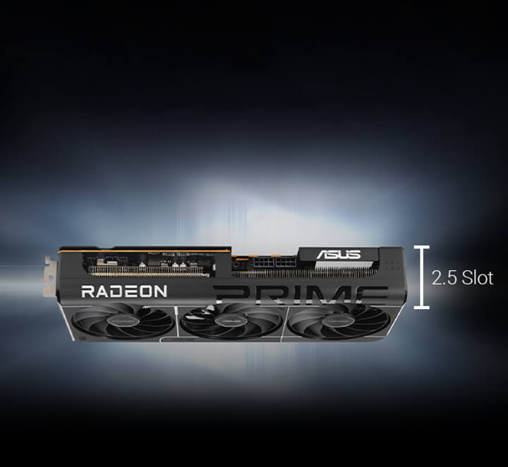 The Prime Radeon™ RX 9070 EVO features a 2.5 slot design with a carefully arranged layout for the shroud, heatsink and heat pipes to let the three Axial-tech fans leverage chassis side-panel ventilation and deliver optimal thermal performance.