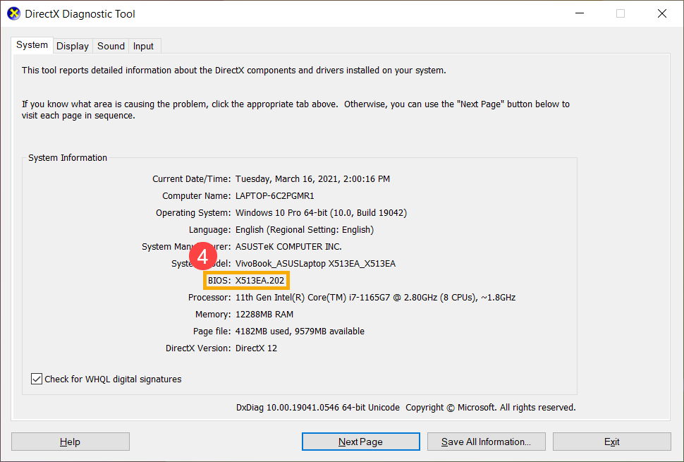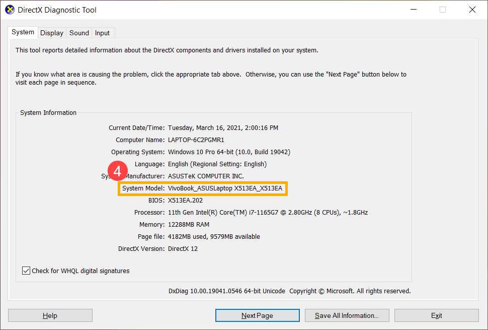 - In the System Model l field, you can locate your device model④. (As shown in the example below, the model is X513EA.)