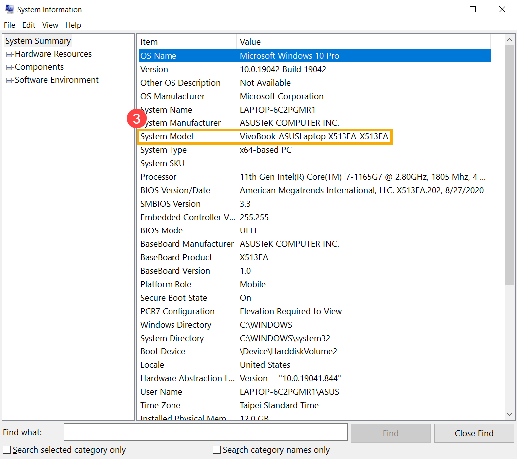 - In the System Model field, you can locate your device model③. (As shown in the example below, the model is X513EA.)