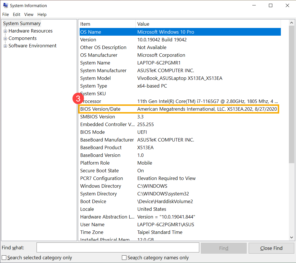 - In the BIOS Version/Date field, you can find your device's BIOS version③. (As shown in the example below, the BIOS version is 202.)